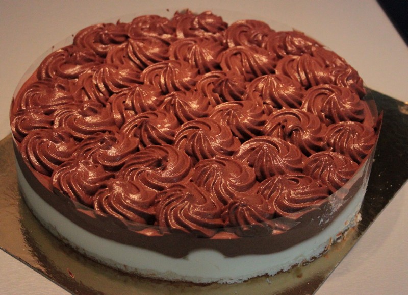 Composé d'une génoise et accompagné d'un mélange de mousse vanille et d'une mousse chocolat.
